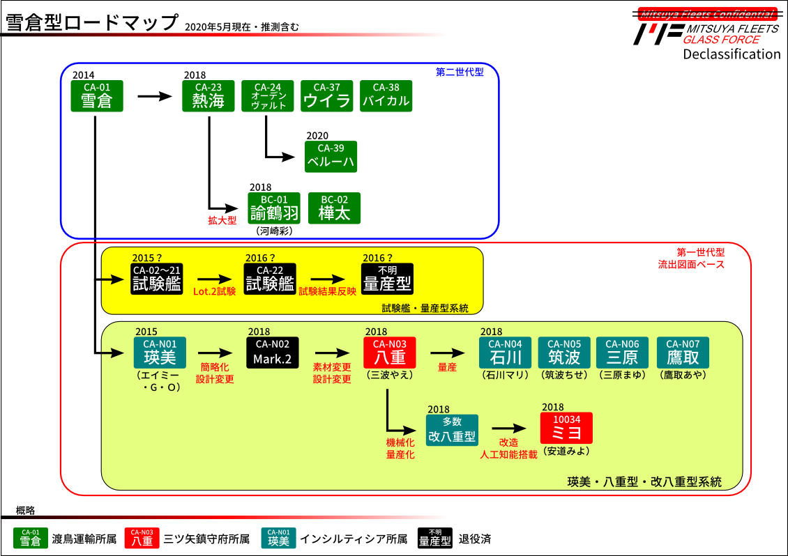 なおフレーム種別については、CAフレームの『雪倉』をベースとした図面であったことから、すべてCAフレームとなっている。艦種自体は、重巡型のエイミーと八重、軽巡型のミヨに分類される。